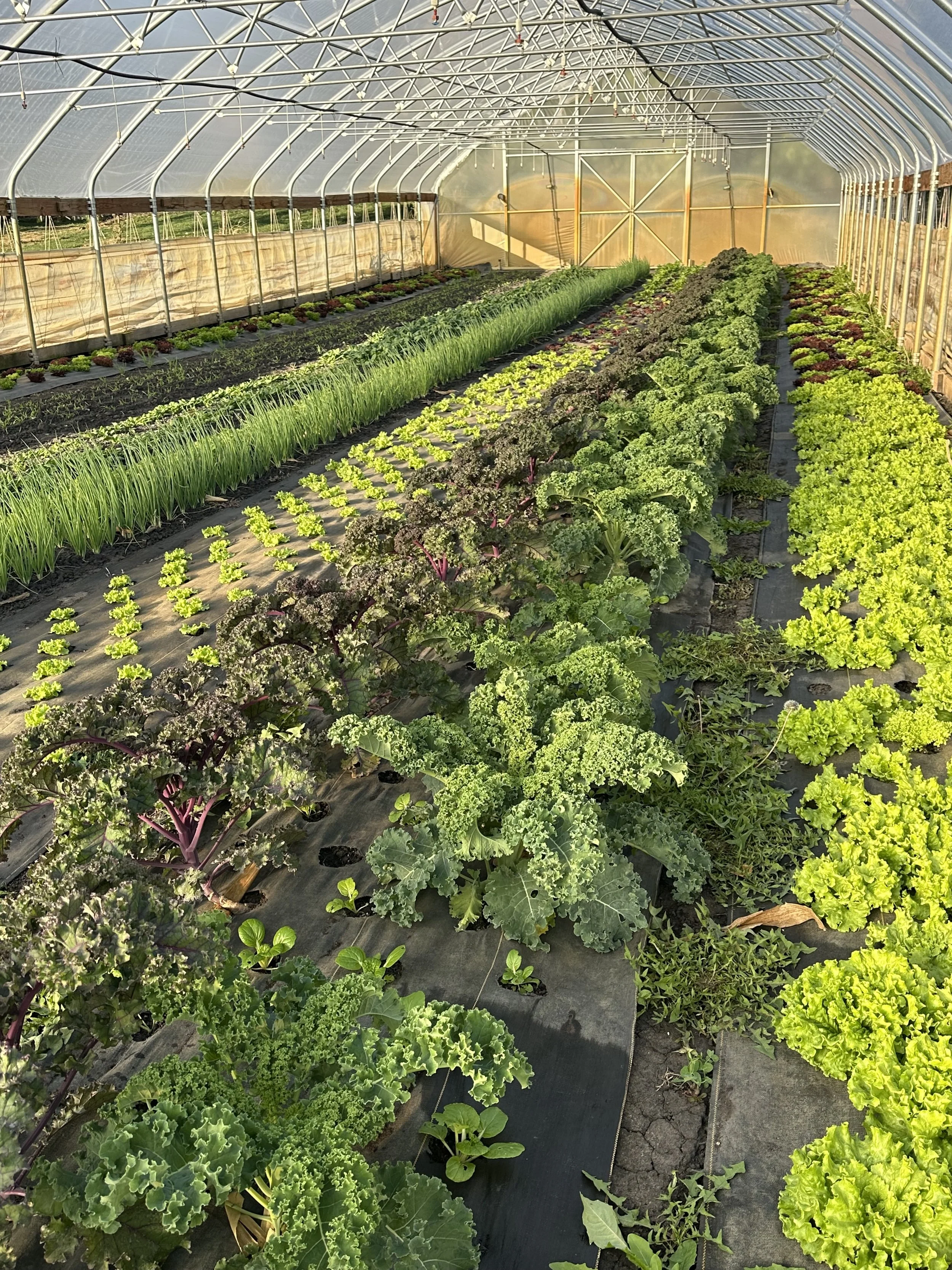 We’ve found that our lettuce mix varieties are actually incredibly cold tolerant and can handle temperatures as low as 15* inside the tunnel before we start to see damage to the plants. Most seasons this means we will have lettuce mix available for November and December. We also trialed a new-to-us butterhead lettuce variety called Landis Winter that is even more cold tolerant than our lettuce mix but the trade-off is that it’s more disease prone. Finally, we head from another farmer that our staple summer green curly lettuce is also incredibly cold tolerant. We’ll see how cold tolerant it is this year but I’m expecting it to be about as good as our lettuce mix.