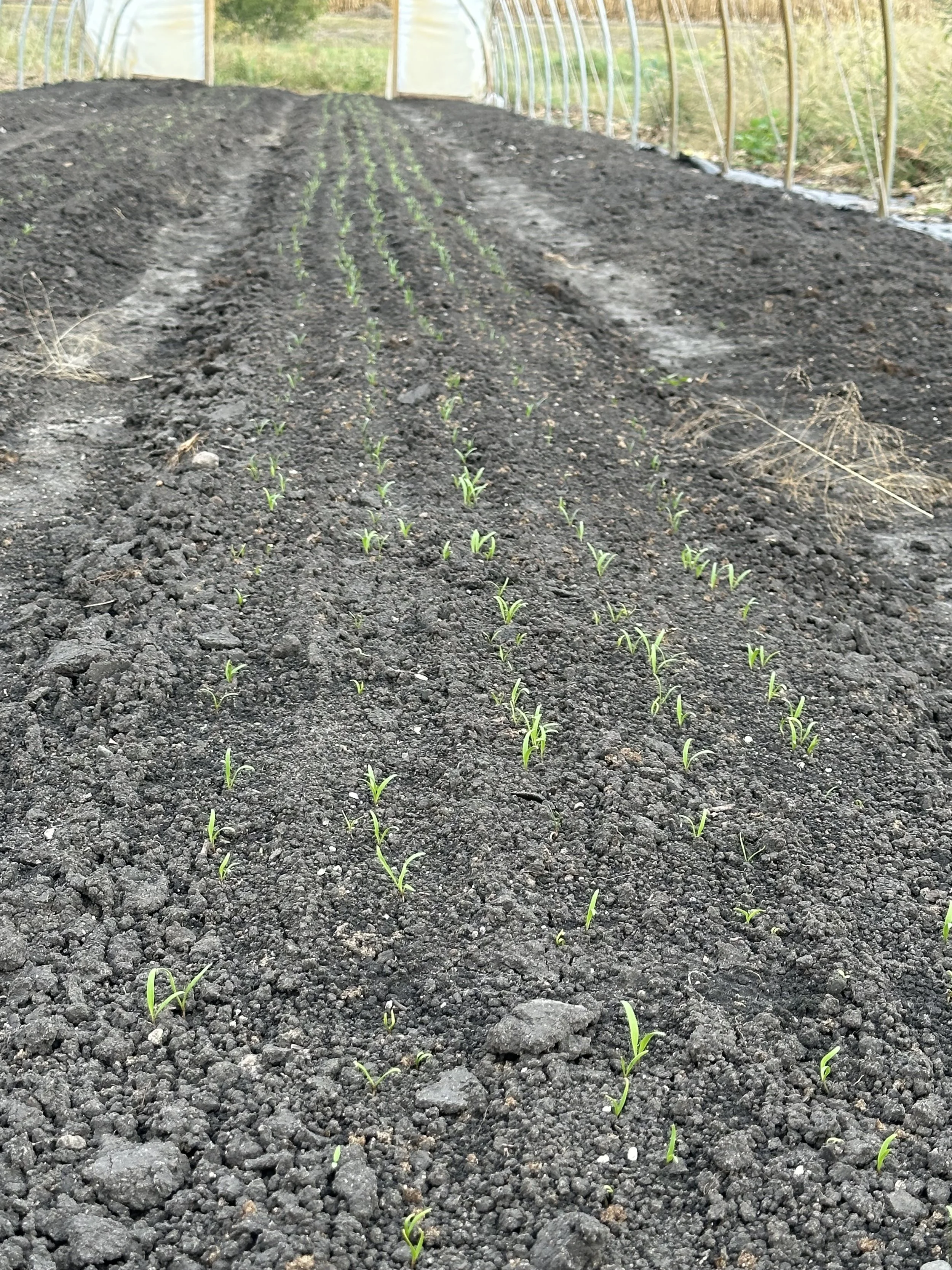 In particular the crop that we’re having the hardest time with during the heatwave is our winter spinach. We seed spinach from roughly late August through early October with the intention of having spinach available for CSAs, online orders, and our farmers market stand from Early October all the way through winter into early next spring. Our first planting of spinach didn’t germinate well at all. So much so that we had to terminate that planting. This is because spinach is very sensitive to soil temperate: it prefers cool soils for optimal germination. Our second planting from early September came in a bit better but we needed to interseed additional spinach to justify the space in our winter tunnel. Our late September planting of spinach came in much better and we’re excited about that planting.