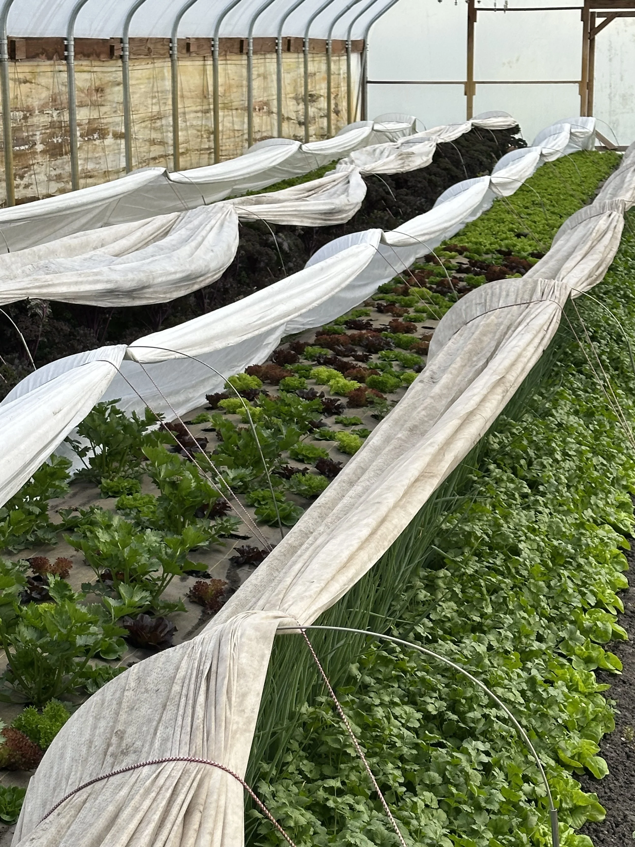 We use the wire hoops to help suspend the row cover over our crops without touching them (except for kale - it’s too big!) which helps both reduce disease pressure by keeping moisture off of plant leaves. It also helps protect the crops better - if the row cover is damp and freezes and is touching the plant leaves then there’s a higher chance that crop will be damaged. There is management involved with the row cover. Depending on the temperature, cloud cover, etc, we’ll need to uncover the crops each morning and cover them again a couple hours before sunset.