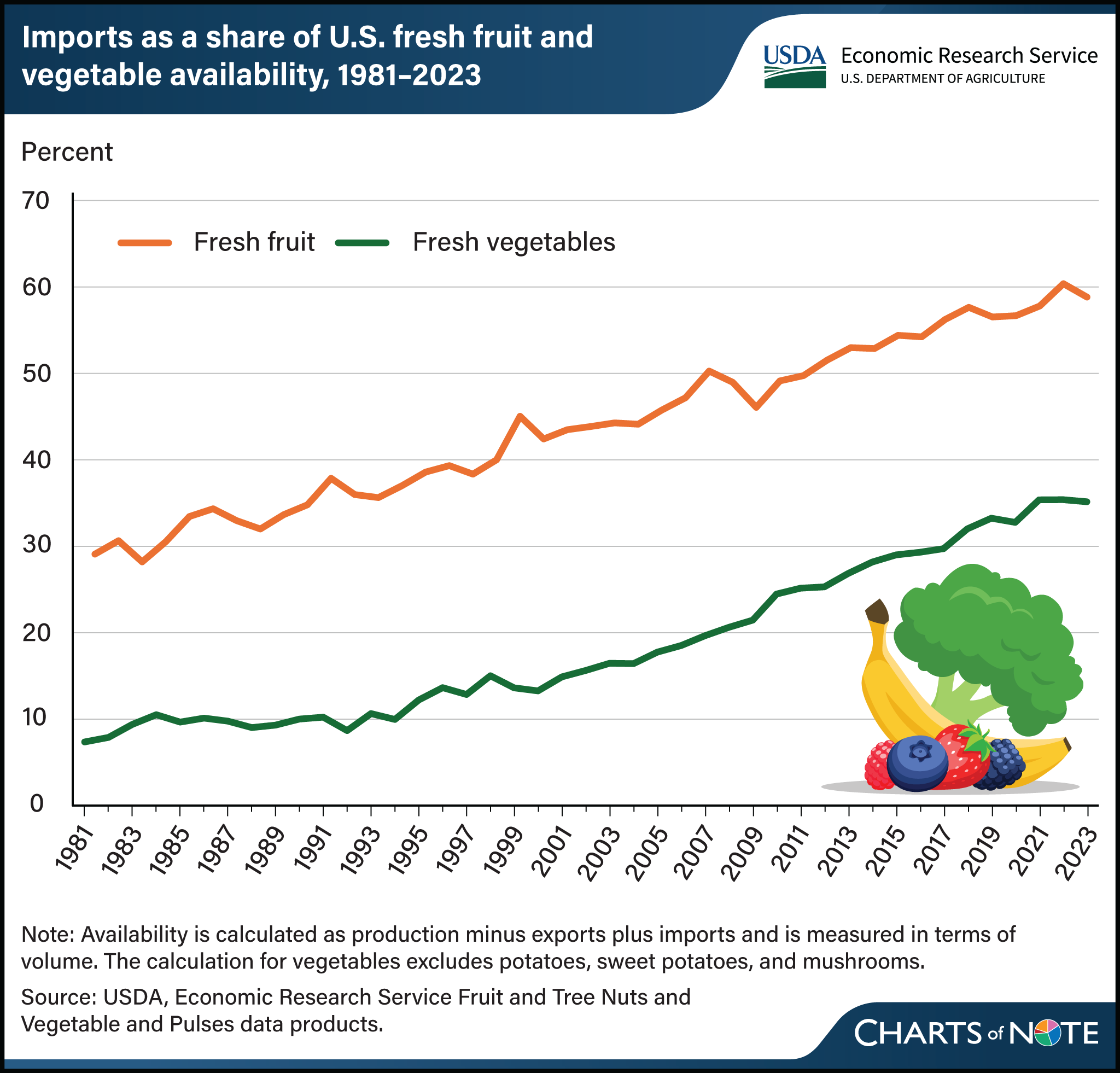 Further, if you look at fruit & vegetable imports since 1980 in the chart below you’ll notice a stead increase in the amount of fruits & vegetables that we import. I think it’s crazy that we have all of this amazing farmland across most of the country and we have to continually import more fruits & vegetables. It doesn’t make sense. If federal farm policy incentivized vegetable production the way it incentivizes commodity production we could flip that chart around.